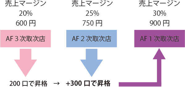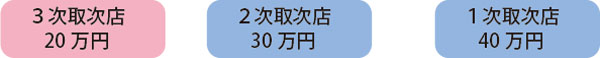 • 3次取次店の方が昇格するに際しては、 昇格者が新しい第三次取次店を推薦して頂くか、リーダーが補填して下さい。
